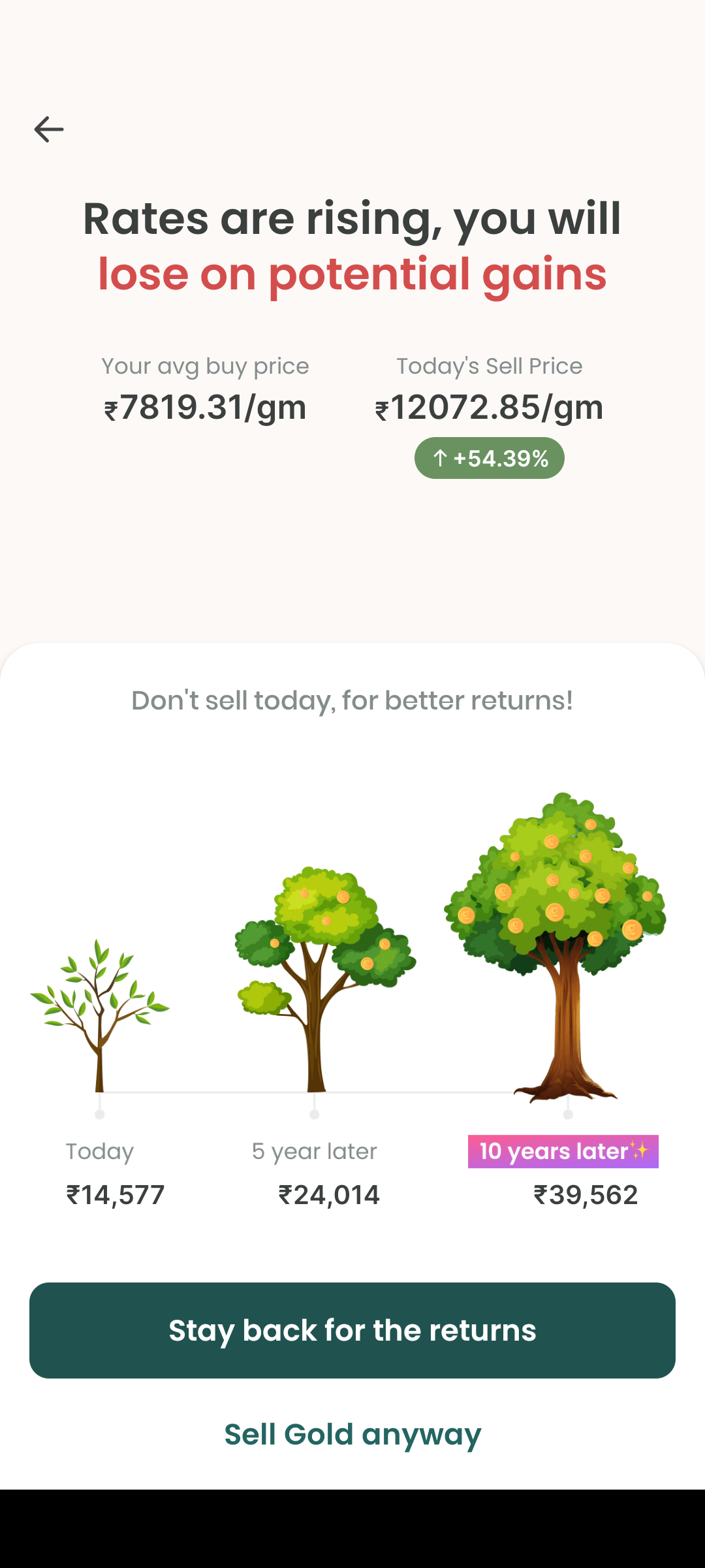 This screen is shown to a user when they try to withdraw their money, persuading them not to do so. Improve this screen to make it more intuitive, so that the user sees the benefits of staying invested.