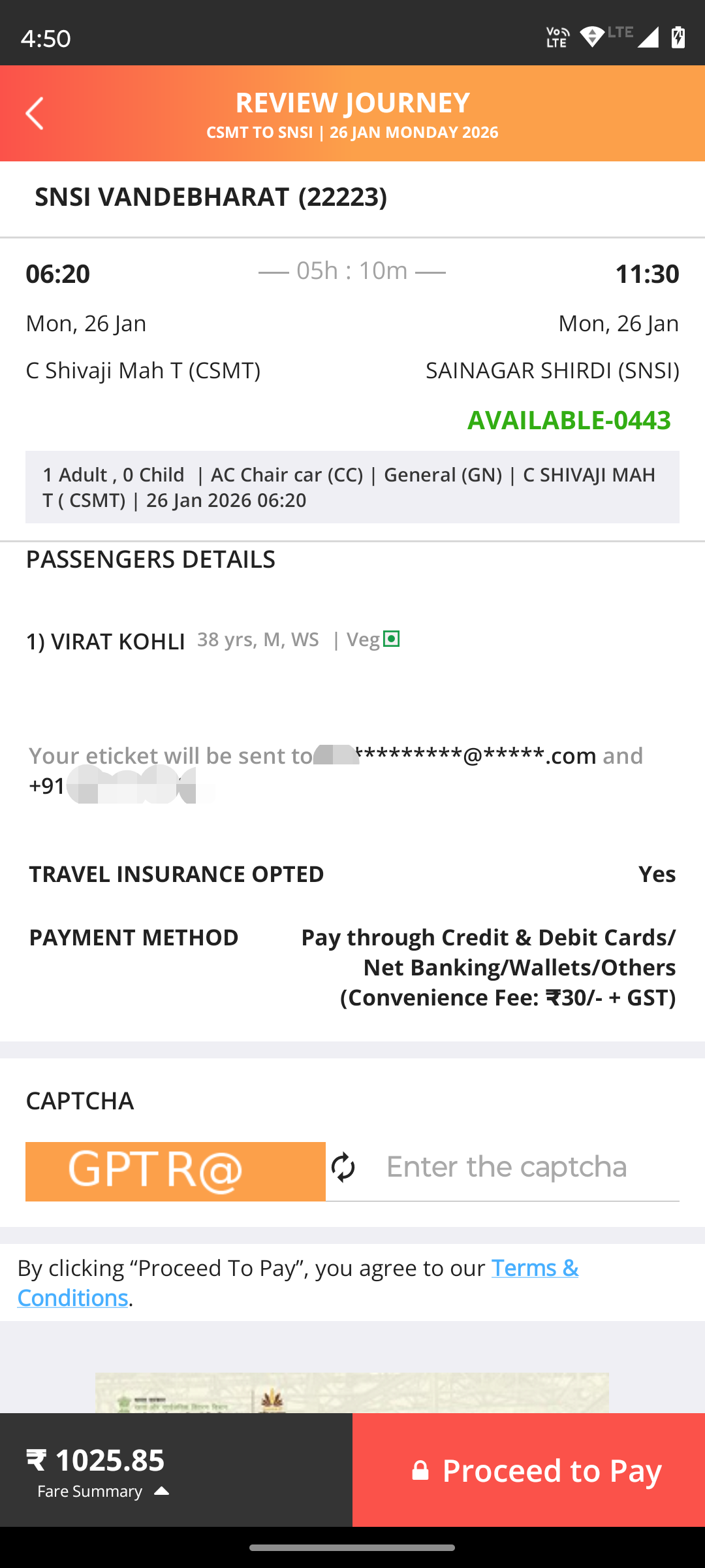 IRCTC is an online ticket booking platform from Indian Railways. This screen shows the final booking screen for a railway ticket, before payment.