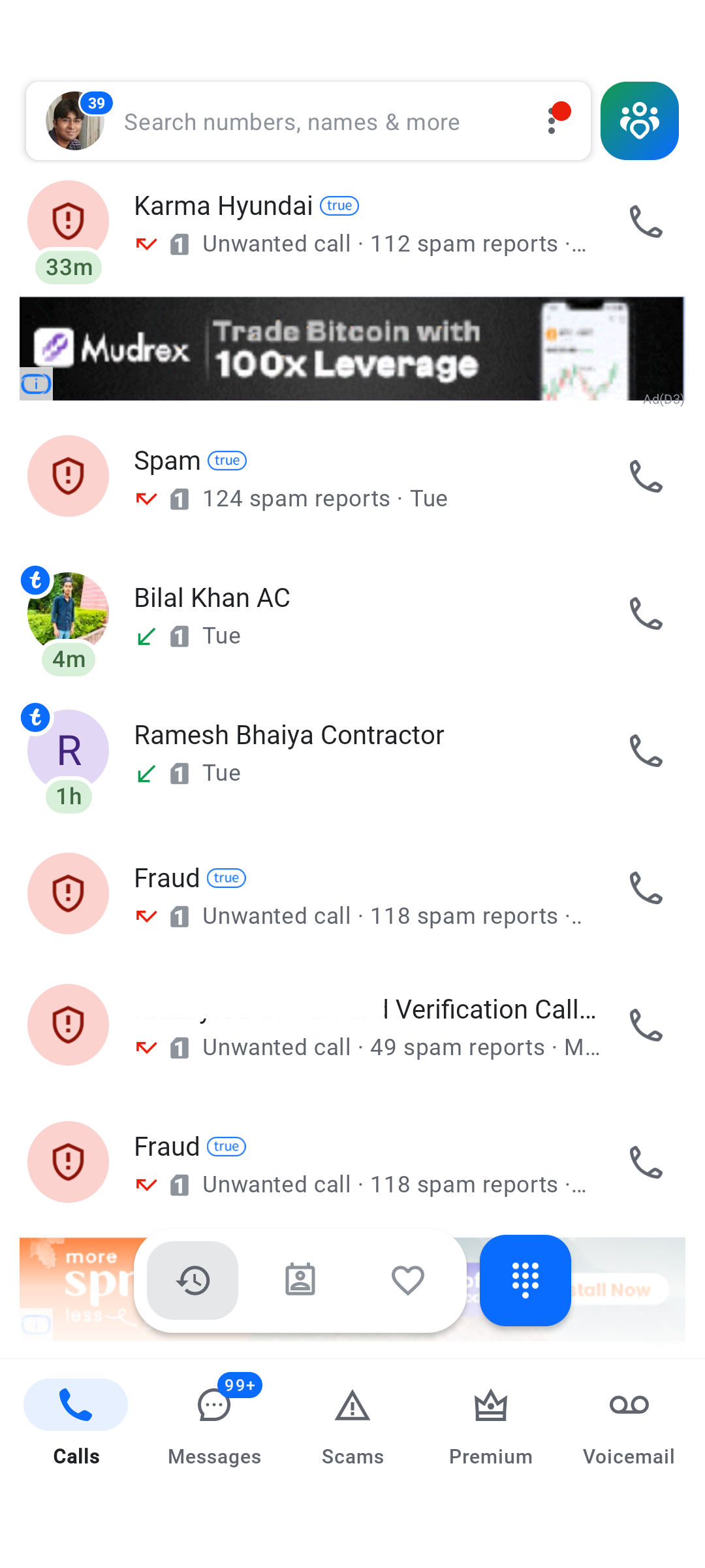 This screen is the main calls tab, the first thing a user sees when they open the app. It shows recent calls and spam warnings.