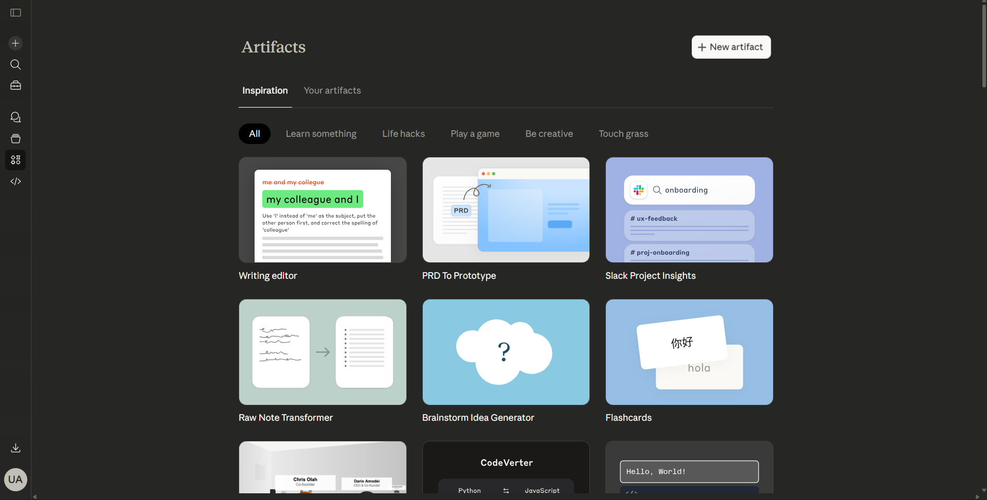 Redesign this one screen (desktop, one fold) to help users to quickly understand what Artifacts can do, easily discover different types of Artifacts, and feel motivated to try one