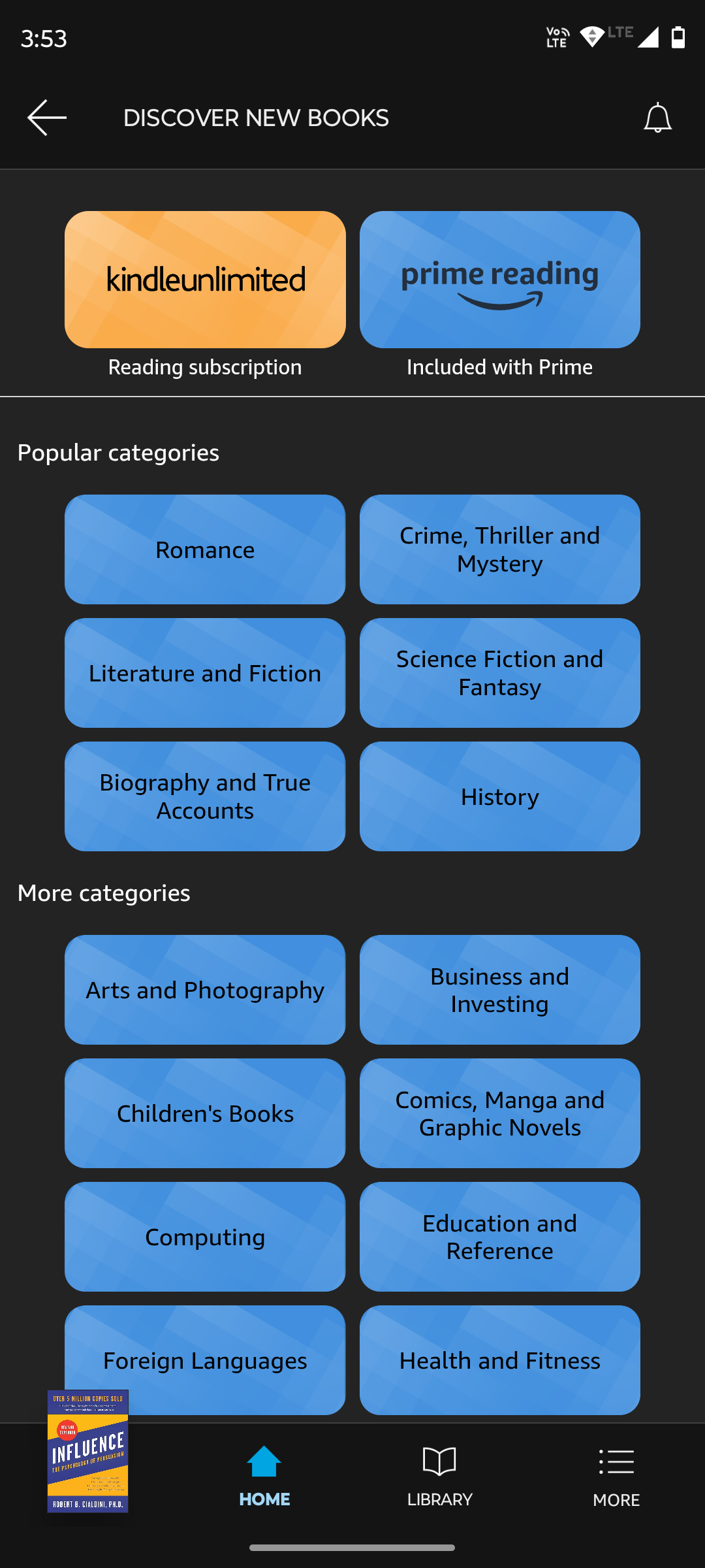 This is the screen shown to users under the 'Explore' tab, when trying to discover new book titles. Improve its design so that it is more meaningful to users, than just a listing of categories, as is done presently. The goal is to make book discovery a delight. You can add elements and completely redesign this screen if needed.