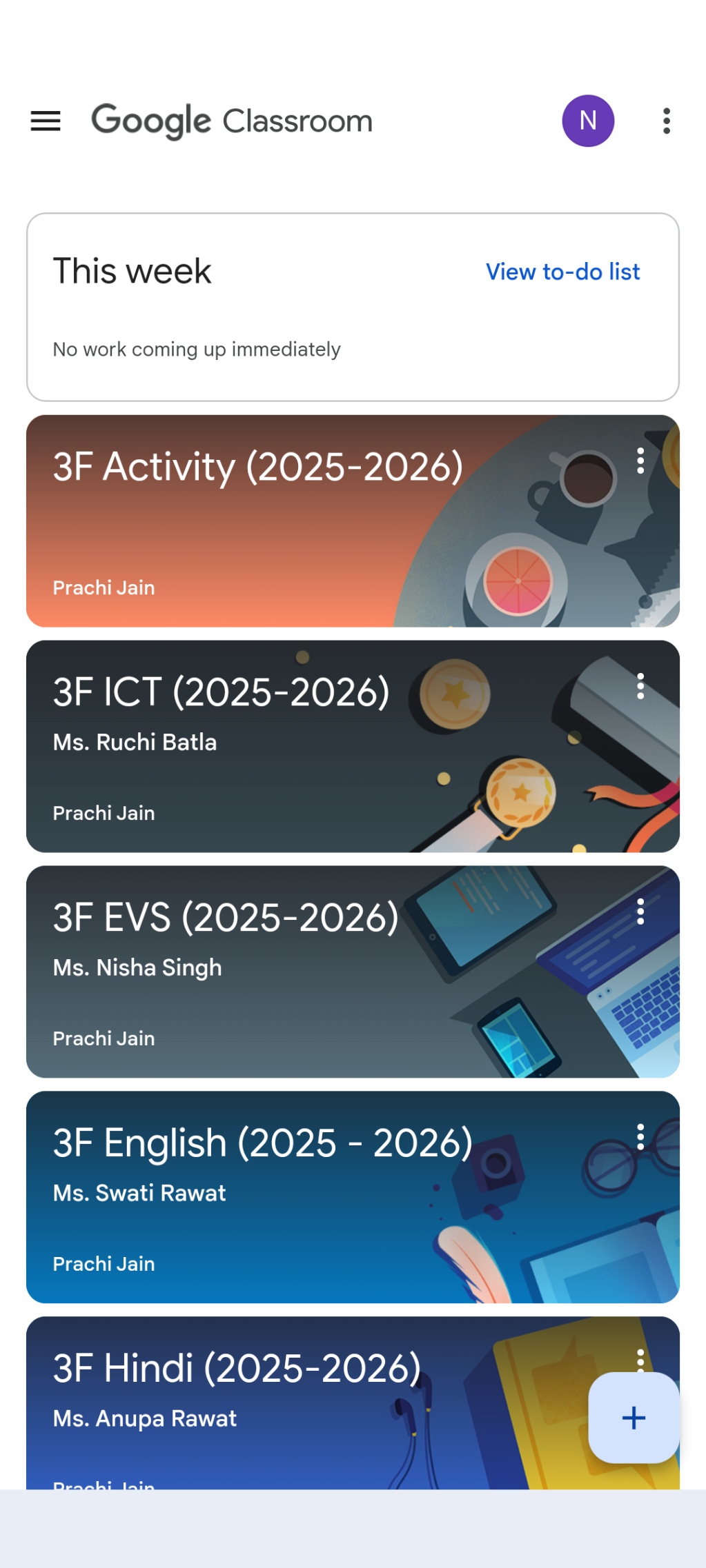 The given screen is the default home screen for students of a Google classroom mobile app. It shows the different classes the student is part of and the respective subject teacher's and class teacher's name.